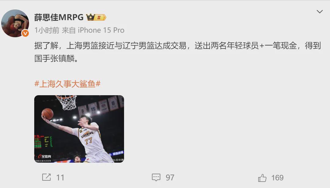 而具体的内容,实际上就是上海男篮送出了相当部分的转会费,外加几个不知名的年轻球员,从辽宁男篮那里换来了张镇麟。