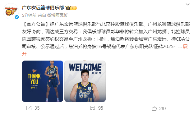广东男篮官方公告写道:“经广东宏远篮球俱乐部与北京控股篮球俱乐部、广州龙狮篮球俱乐部友好协商,现达成三方交易:我俱乐部球员彰华非将转会加入广州龙狮;北控球员陈国豪独家签约权交易至广州龙狮;同时,焦泊乔将转会加盟广东宏远。待CBA公司审核、公示通过后,焦泊乔将身披16号战袍代表广东东阳光队征战2025-26赛季CBA联赛。”