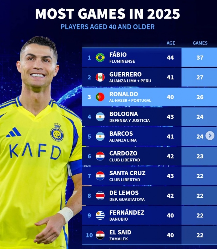 刚刚随弗鲁米嫩塞打进世俱杯四强的44岁老门将法比奥以37场居首,曾效力过拜仁的秘鲁41岁锋线老将保罗-格雷罗在今年为利马联盟和秘鲁国家队共计出场27次,40岁的C罗则为利雅得胜利和葡萄牙国家队出场26次。